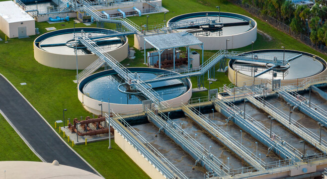 Aerial view of water treatment factory at city wastewater cleaning facility. Purification process of removing undesirable chemicals, suspended solids and gases from contaminated liquid