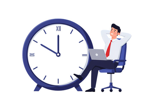 Relaxed Businessman with Laptop Beside Oversized Clock isolated on transparent background