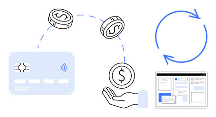 Credit card, flying coins to hand, digital interface, blue circular arrow illustrating recurring payments. Ideal for finance, online payment, e-commerce, automation, fintech transactions