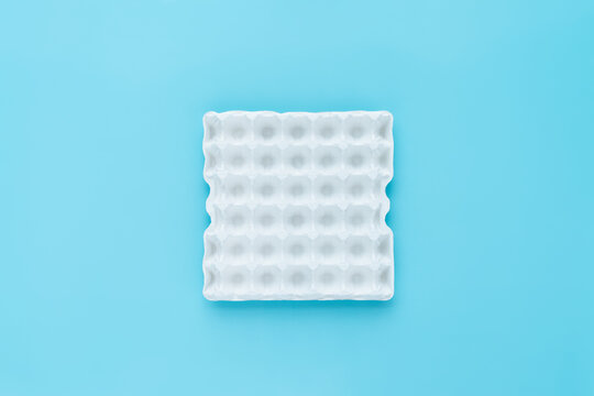 Still life of empty white egg carton for thirty eggs standing on turquoise surface, directly above view