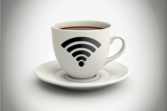 a cup of coffee sitting next to a plate with an wifi sign on it