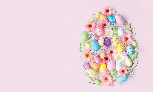 Easter monday celebration concept with pastel eggs and tulips