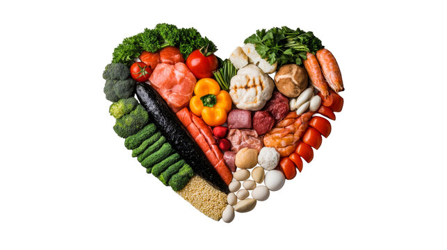 Healthy food heart shaped composition, vegetables, fish, cut out transparent