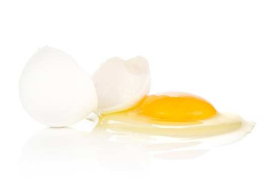One cracked white chicken egg isolated on white background two pieces of shell and raw fresh yolk.