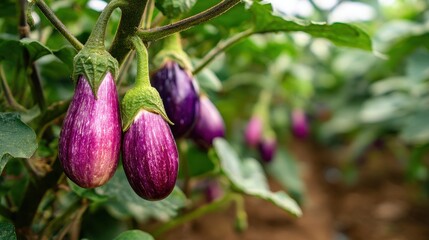 Fresh purple eggplant dangling from the plant in the field ready for harvest A nutritious vegetable