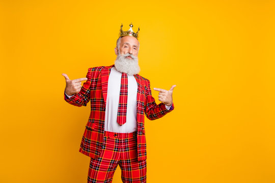This is me. Photo of cool look grandpa white beard haughty person pointing fingers himself wear crown plaid red suit clothes isolated yellow color background