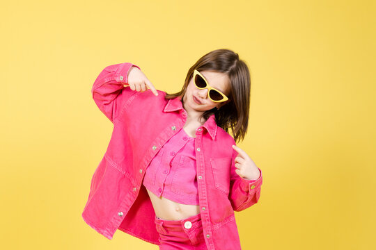 Arrogant little girl pointing herself isolated on yellow background. Egocentric child concept
