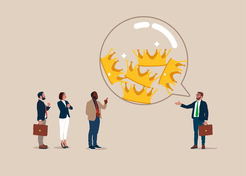 Businessman pumping balloons Crown sign, extreme self-involvement too much impaired self-confidence, proud attitude. data vector illustration on white background.