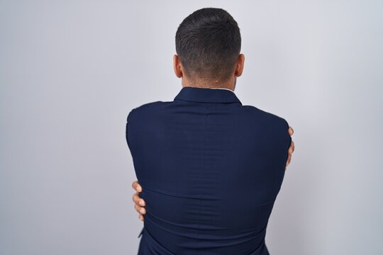 Handsome hispanic man wearing suit and tie hugging oneself happy and positive from backwards. self love and self care