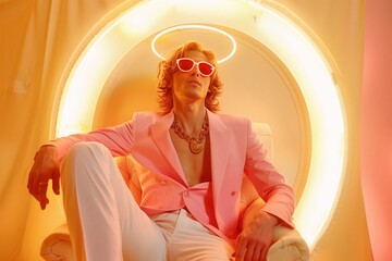 A selfish male narcissist with a crown over his head sits in a chair.