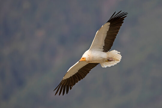 Egyptian vulture in the Rhodope mountains. White scavenger vulture is observing in the mountains. Bulgaria nature.