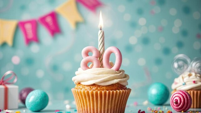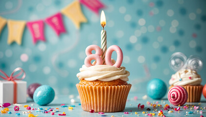 Birthday cupcake with burning lit candle with number 80. Number eighty for eighty years or eightieth anniversary.