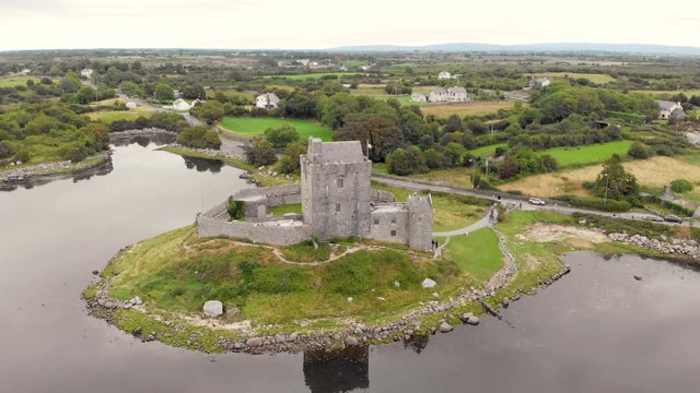 An aerial view of Dunguaire Castle, a 16th-century tower house situated on the south-eastern shore of Galway Bay, thought to be the most photographed castle in Ireland.