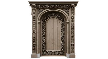 Ornate carved wooden door with elaborate baroque decorative frame and archway