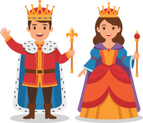 Charming and colorful full-body characters: a royal monarch and his queen wearing elaborate crowns and waving greetings to their subjects.