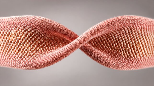 A knitted elastic band suspended midair capturing detailed loops and stretchiness in focus with an outoffocus neutral background.