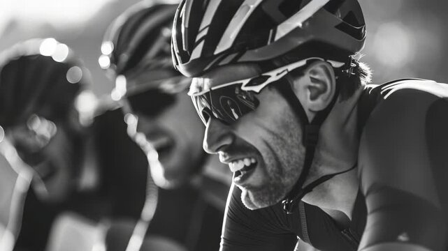 An elated man winning a bicycle race with his face lit up with joy, surrounded by blurred competitors and spectators in the background.