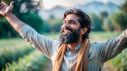 Free-Spirited Indian Man Celebrating Life in a Lush Green Meadow