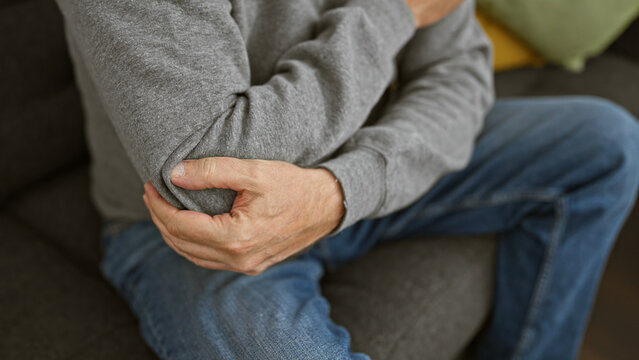 A middle-aged man with grey hair experiencing elbow pain at home, conveying a sense of discomfort.