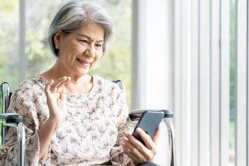 An elderly lady is lying on a bed, using a mobile phone to communicate, displaying a happy smile