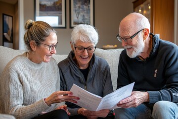 An elder care specialist discussing care plans with the family of an elderly patient, offering support in a cozy living room