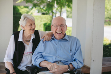 Happy, fun loving elderly couple outside in garden using wheelchair
