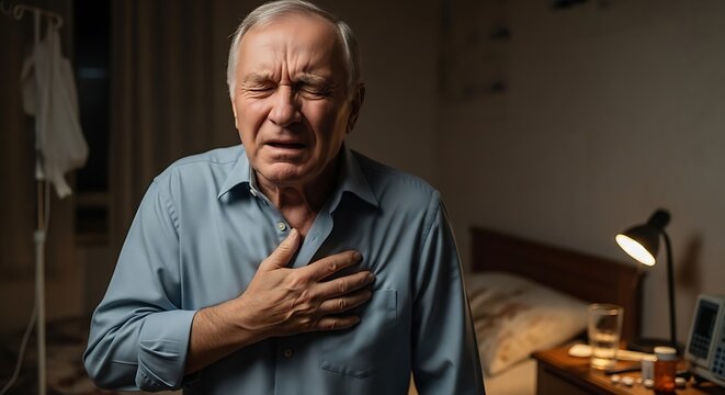A senior man clutches his chest, expressing pain and distress in a dimly lit bedroom setting.