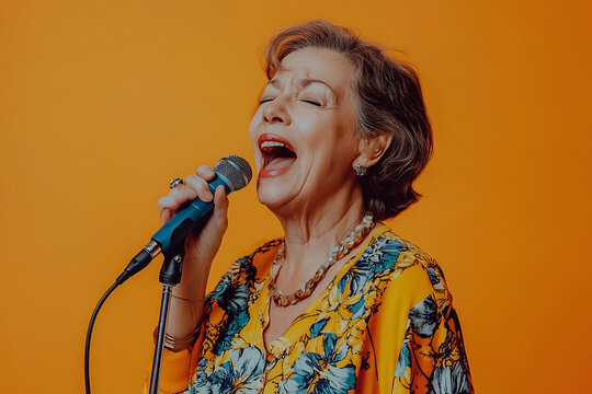 Elderly woman with closed eyes holding microphone and singing on orange background