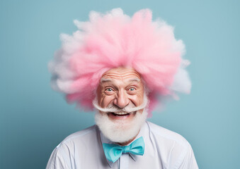 A cute cheerful elderly gentleman disguised as a clown is laughing and posing. Bright cheerful colors. Children's balloon party. Generative AI
