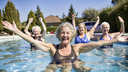 Cheerful senior lady exercising in swimming pool. Group of mature women doing gymnastics in the gym pool. Healthy lifestyle for elderly people.