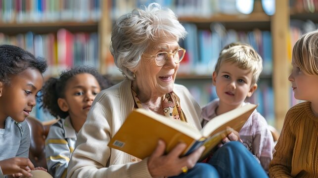 Vibrant senior woman with silver hair using a laptop in a library setting, showcasing lifelong learning and tech adaptability. AI generation