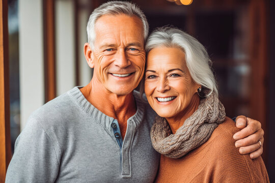 Happy senior couple portrait. Smiling cheerful elderly couple embracing and posing for camera. Generative AI