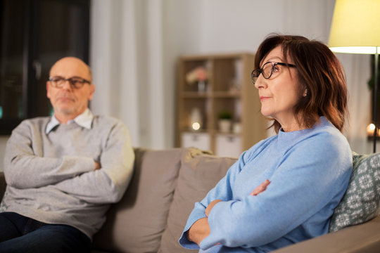 relationships difficulties, problem and people concept - unhappy senior couple sitting on sofa at home