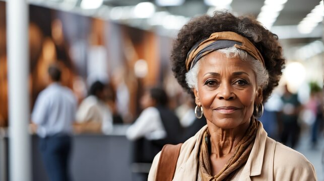 Beautiful elderly black african woman on work fair in exhibition hall job hunting looking at camera banner copy space template backdrop portrait from Generative AI