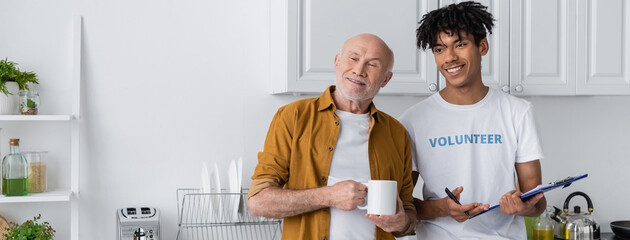 Cheerful african american volunteer holding clipboard near pensioner with cup in kitchen, banner.