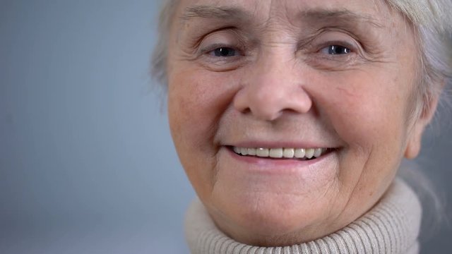 Face close-up of smiling elderly woman, social security, taking care in old age