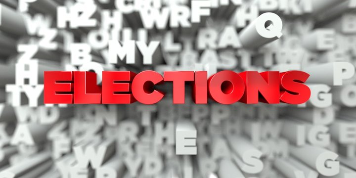 ELECTIONS -  Red text on typography background - 3D rendered royalty free stock image. This image can be used for an online website banner ad or a print postcard.