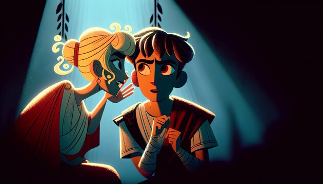 A whimsical, animated art style image showing Electra whispering into her brother Orestes' ear, set in a Greek mythology theme.