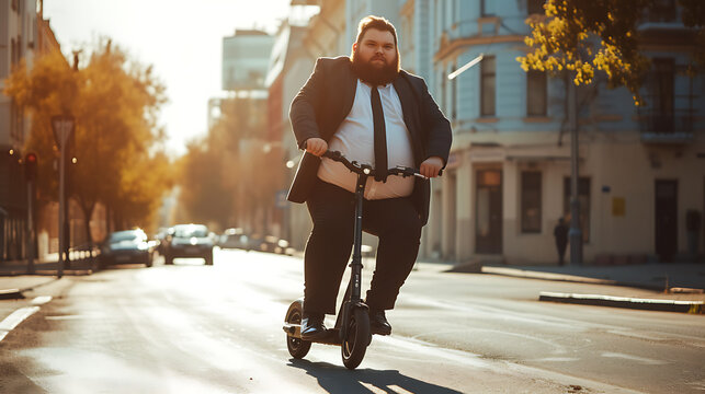 A young plus size guy in a suit riding an electric scooter around town. fun business style. Generative AI