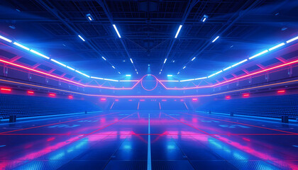 Futuristic Esports Arena Digital Stage Red Blue Neon Lights Gaming Tournament Championship Cyberpunk Style Modern Technology Broadcast Studio