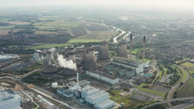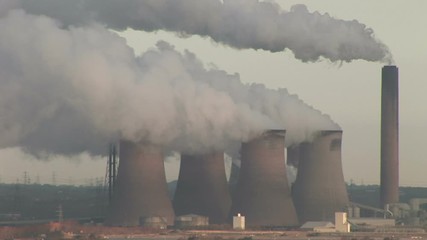 Industrial landscape of Manchester with coal fired power station and smoke