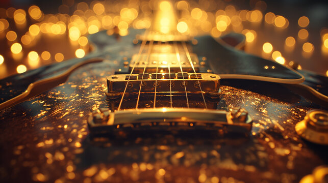 Close-up of the strings of a golden electric guitar against a blurry background of bright yellow lights.