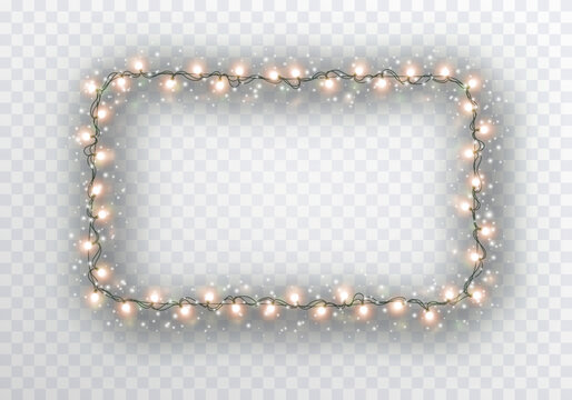 Lights bulbs frame isolated on transparent background. Glowing fairy Christmas garland string border. Vector New Year party led lamps decoration