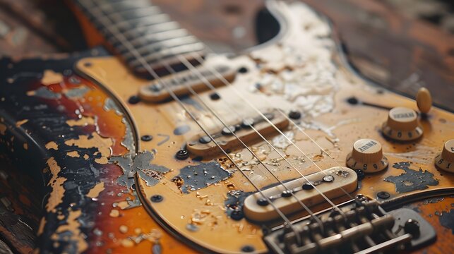 closeup of a vintage electric guitar in black and white. Copy space image. Place for adding text and design