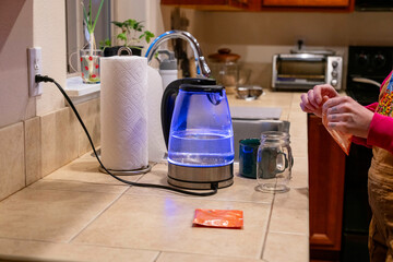 Electric kettle filling with tap water from kitchen sink, Daily water boiling preparation process