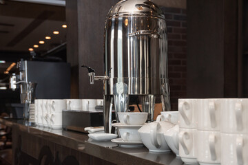 Large electric kettle boiler with hot water for tea, cups and mugs on the bar prepared for self-service breakfast buffet.