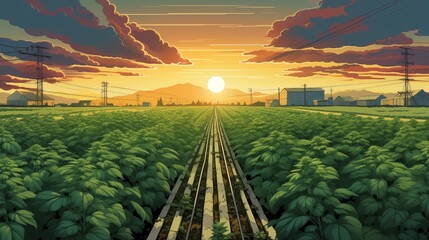 Sunset over Verdant Fields with Tracks Leading to the Horizon