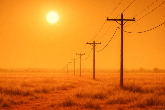 Power lines stretch across a parched rural field under an intense, blazing sun. The hazy, orange sky and dry grasses emphasize theme of extreme heat, climate change, drought, infrastructure resilience