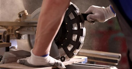 Builder hands cutting wooden board with circular saw closeup 4k movie slow motion. Woodworking and furniture production concept