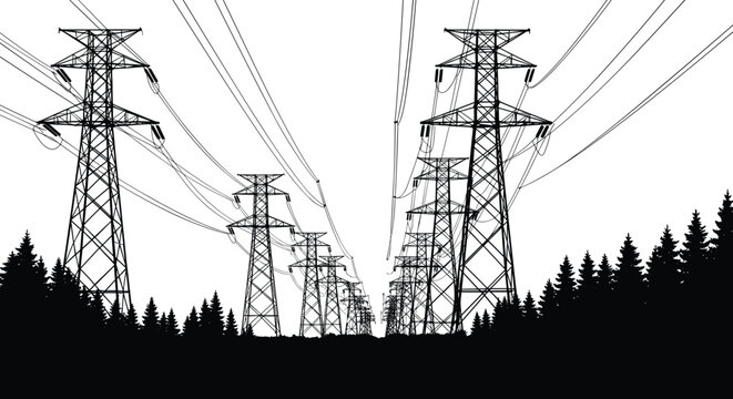 High electric tower. High-voltage poles with wires go away into the horizon. Electric poles. Production of sustainable energy concept. Graphic vector isolated on white background.
